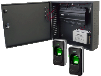 Panel de control con lectores de tarjetas de proximidad y lectores de huella. Capacidad 30,000 tarjetas, 20,000 huellas y 100,000 registros.