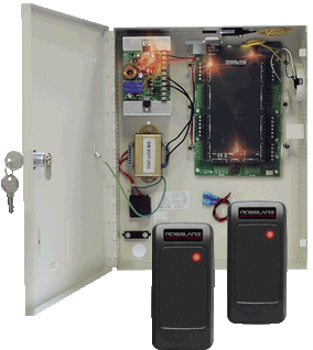 Panel de control con lectores de tarjetas de proximidad. Capacidad 30,000 tarjetas y 20,000 registros.